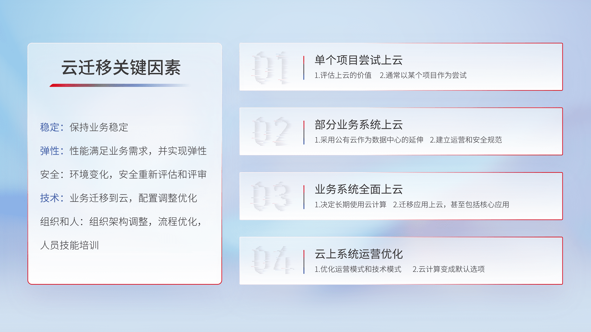 结合实际业务,,,,从规划设计、、、云平台选型、、、云原生改造、、数据迁移、、、集成交付,,迁移全过程为客户识别最佳上云路径,,做好风险识别管理,,设计网络架构、、、身份权限、、安全审计合规、、、操作审计、、日志审计、、、监控告警策略、、、多站点容灾设计等,,,,对云上基础设施进行整体规划,,,,提升IT治理水平,,以满足弹性、、、、高可用、、、高性能的需求。。