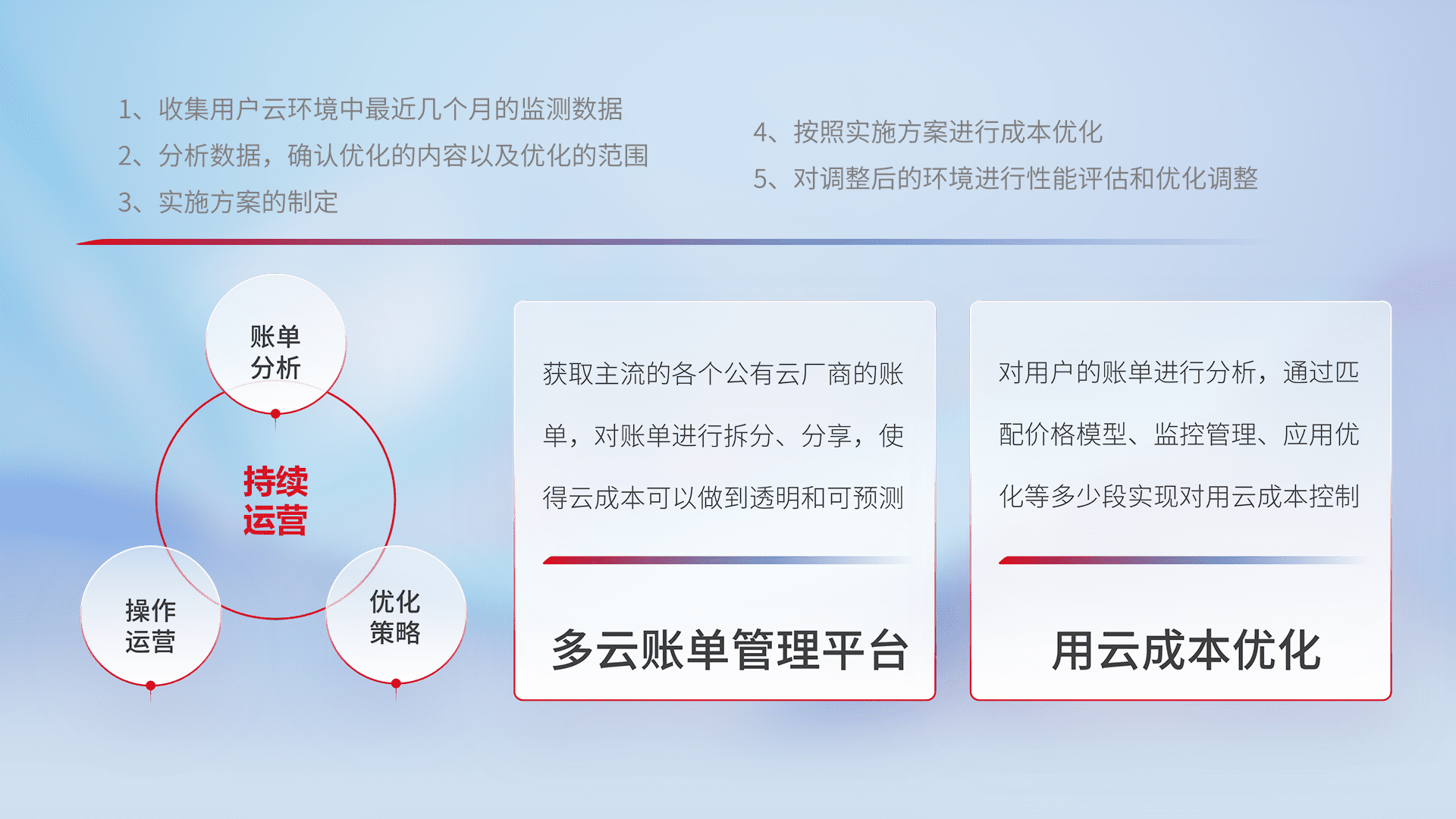 通过多云纳管,,,,以统一的资源数据模型把客户的云资源进行抽象和封装,,,进而实现对多云资源的统一操作,,保障云资源管理的可靠性、、稳定性与可用性。。量身定制化运维内容,,,配置、、开发运维、、、、补丁管理、、、、备份、、、、监控、、、认证和访问管理、、审计和日常巡检等,,,保障在用云过程中的可靠度,,,稳定度以及高可用率。。。。